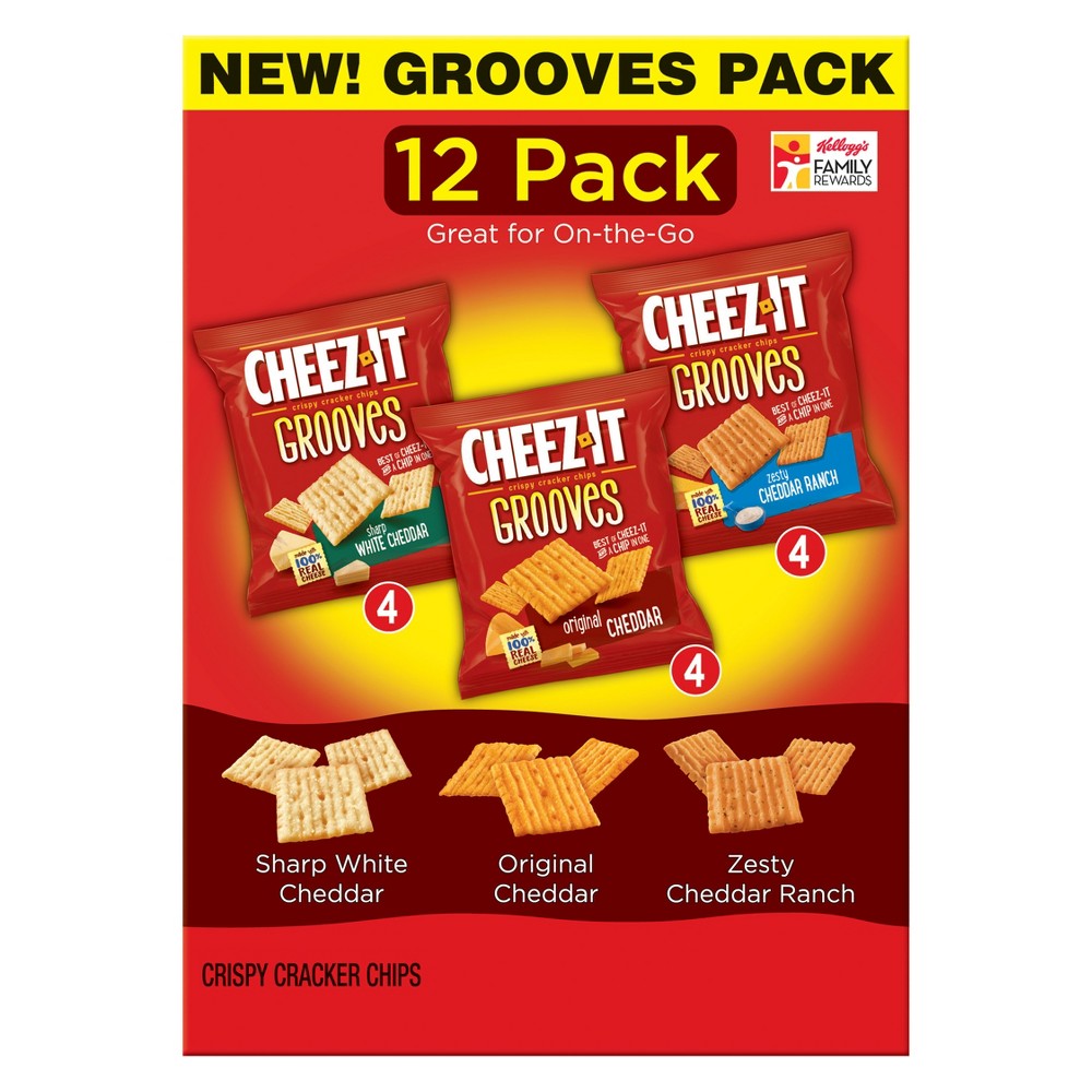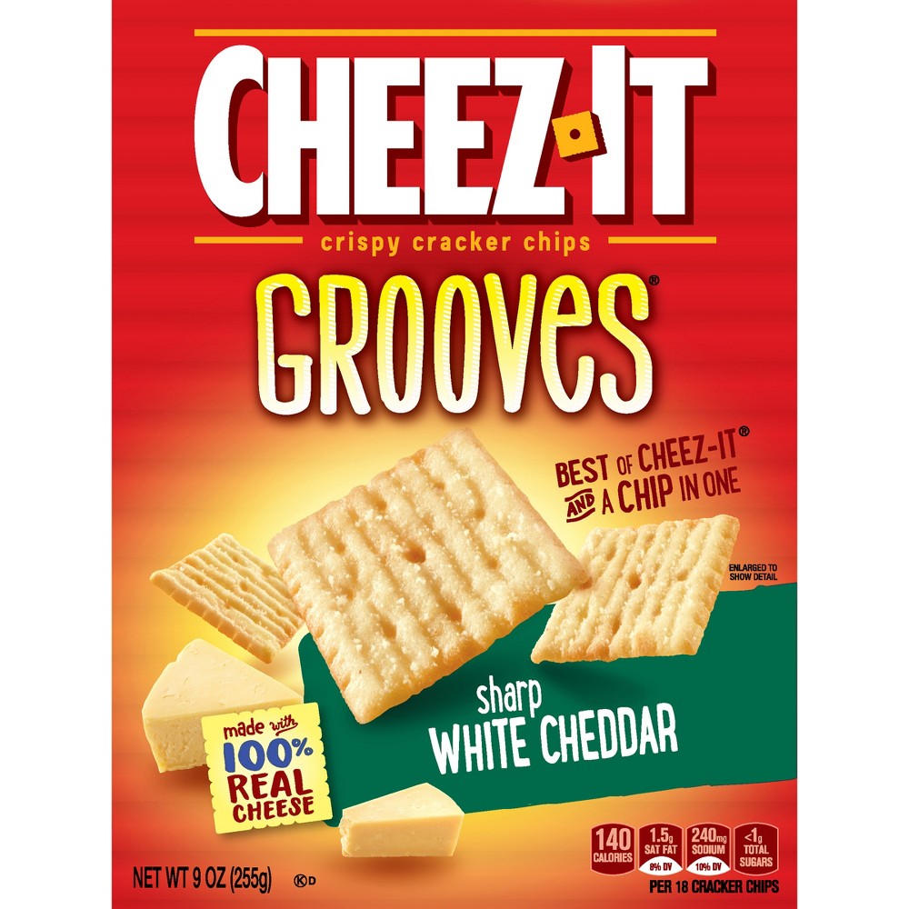 Grab a box of cheez it grooves original cheddar and taste the bold flavor of real cheese in every crispy crunchy bite. Cheez it grooves sharp white cheddar crackers extra crunchy cracker chips for the perfect snack. Ingredients contain wheat milk and soy. Contains wheat milk and soy ingredients.
